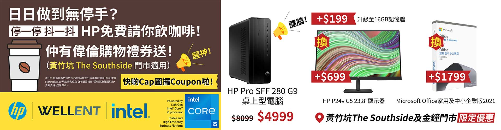 在優惠期內,顧客凡於偉倫黃竹坑或金鐘門市購買指定HP Pro SFF 280 G9 桌上型電腦,即可享有減價優惠 及 指定產品限定加購優惠。 在偉倫網店下單,於黃竹坑或金鐘門市自取亦可以享有以上優惠! 受條款及細則約束,數量有限,售完即止。