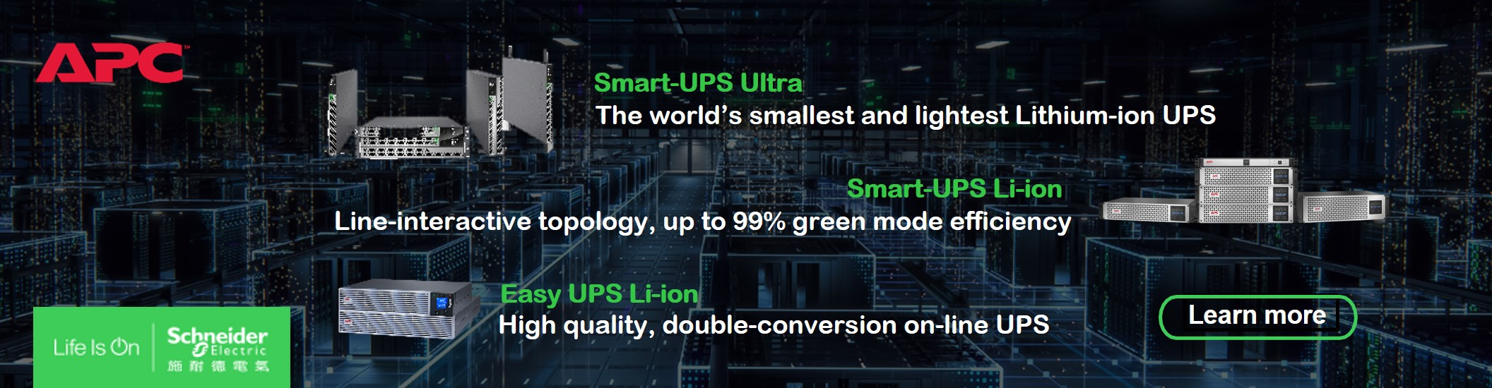 APC 提供不間斷電源系統(UPS),保護設備和關鍵數據不受中斷, 廣泛應用於資料中心、伺服器、網路設備、工業自動化及關鍵基礎設施等領域。