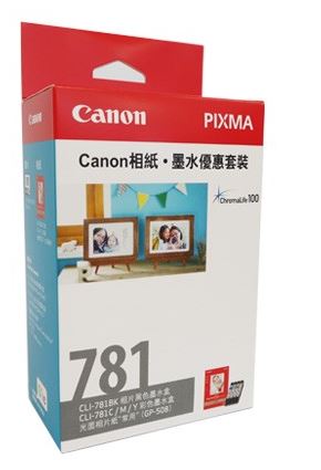 優惠套裝包含CLI-781黑/靛藍/洋紅/黃色墨水盒及GP-508 光面相片紙 4R (20 張) 兩包